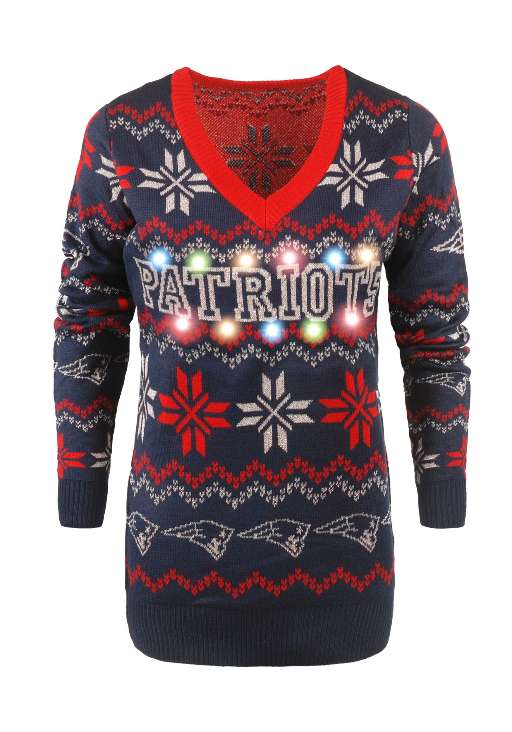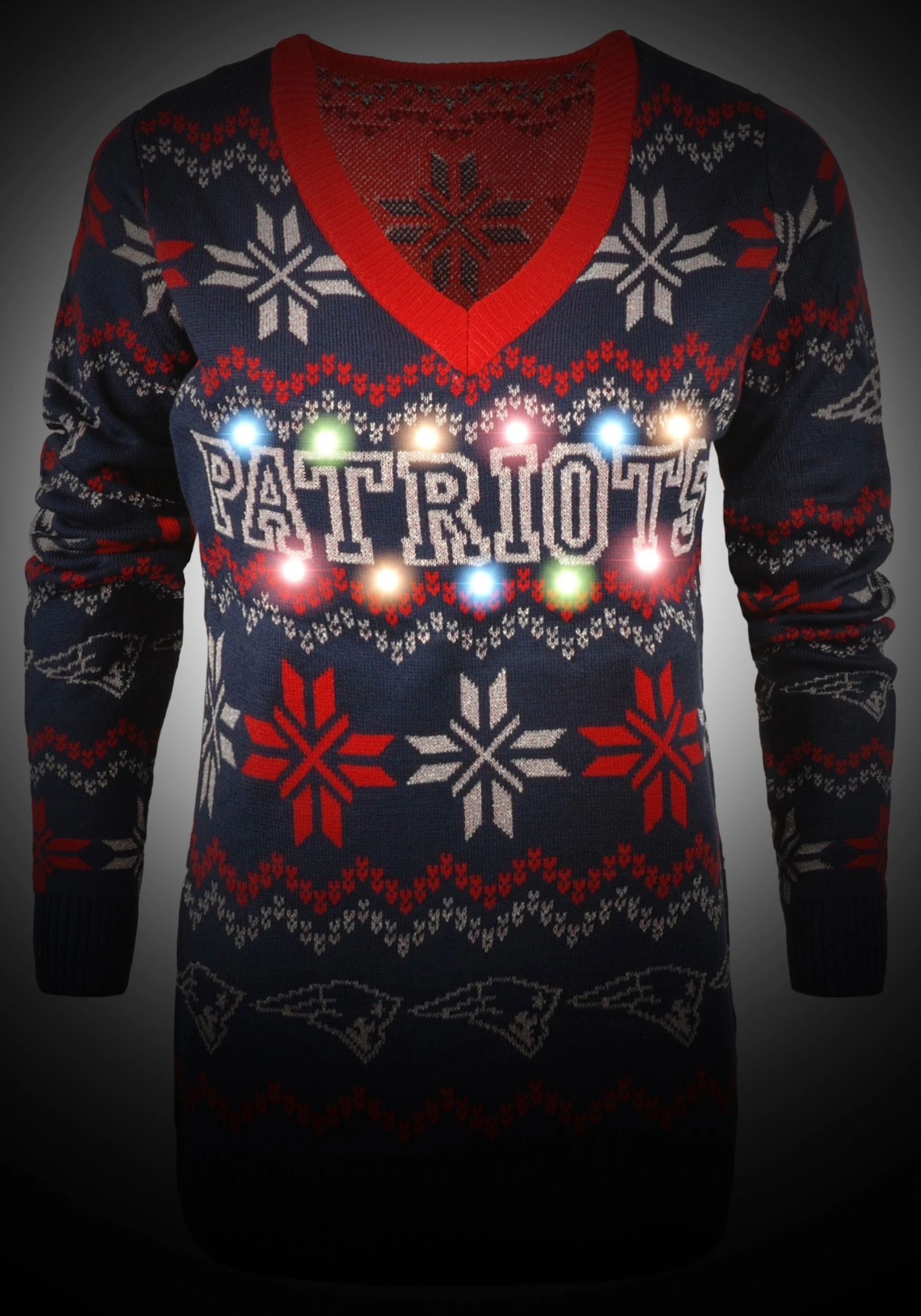 NFL officially licensed, this women’s New England Patriots Ugly Christmas sweater is made out of an acrylic, polyester, and metallic fibers blend. It even has a high-tech function: it has speakers attached to the sweater and an integrated string of lights in the front. You can connect your Bluetooth enabled device to play your music right through the sweater while the lights flash along!