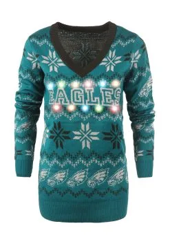 This Philadelphia Eagles Light Up V-Neck Bluetooth Sweater is the perfect way to infuse your love of Philadelphia football into the holiday season. Best part of all? It lights up! With integrated LED lights that flash along to your Bluetooth tunes, you’ll be both super Eagles fan and a festive holiday reveler!